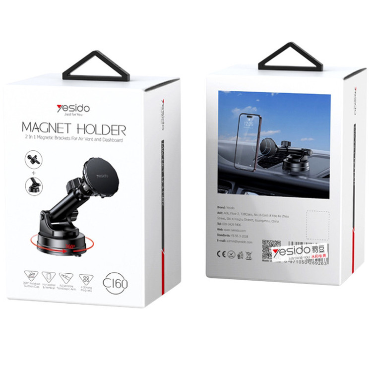 هولدر مگنتی مدل C160 محصول کمپانی نام آشنا و باکیفیت یسیدو یکی از محصولاتی است که میتوانید با استفاده از آن بدون اینکه حواستان از رانندگی پرت شود، به صفحه موبایل خود نگاه کرده یا با آن کار کنید. این هولدر میتواند بر روی میز کار، شیشه، داشبورد و همچنین با وجود پایه دوم بر روی دریچه کولر خودروی شما نصب شود و با استفاده از مگنت و خاصیت آهن ربایی موجود در خود، تلفن همراه شما را در طول مسیر ثابت نگه دارد. پایه نگهدارنده مگنتی C160، ابتدا از یک سمت با استفاده از مگنت، به تلفن همراه شما متصل شده و از سمتی دیگر به میز کار یا خودرو وصل میشود. خاصیت آهنربایی این مگنت در حدی است که حتی تکانهای شدیدِ ماشین نیز، نمیتواند باعث افتادن یا آسیبدیدن موبایل شما شود. یکی دیگر از ویژگیهای نگهدارنده مگنتی یسیدو ، اندازه ی صفحه ی مگنتی بزرگ آن است که؛ باتوجه به این ویژگی و قابلیت، دیگر لازم نیست نگران اندازه شدن سایز موبایل خود باشید؛ زیرا این هولدر برای بیشتر تلفنهای همراه موجود در بازار مناسب است. پایه نگهدارنده و همچنین محل اتصال موبایل به هولدر قابلیت تنظیم زاویه و جابجایی را دارند و ویژگی خاص این کالا "قابلیت چرخش 360 درجه از پایه و محل اتصال" آن به خودرو است تا بتوان موبایل را در بهترین وضعیت برای دید راننده قرار داد. همچنین این هولدر، دارای بازوهایی از جنس سیلیکون مرغوب در قسمت زیرین خود است که به نصب آسانتر این نگهدارنده بر روی داشبورد خودروی شما کمک میکنند.