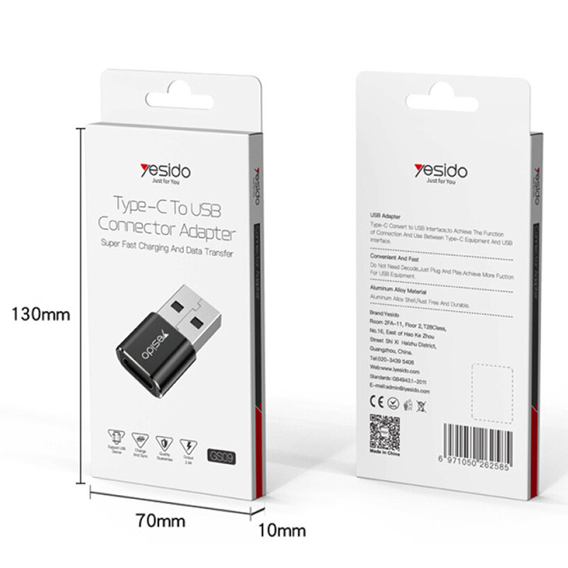 جنس بدنه مبدل یسیدو GS09 از آلیاژ آلومینیوم ساخته شده و ابعاد این محصول کوچک و تنها .۵x۱٫۲x۲٫۵ سانتیمتر است .طراحی کوچک و جمع وجور و وزن سبک در این محصول سبب راحتی در حمل و نقل و استفاده از این محصول می باشد. تبدیل Yesido GS09 در واقع تبدیل کابل تایپسی به USB جهت اتصال به انواع درگاه های USB است. توسط این تبدیل می توانید گوشی و یا دستگاه هوشمند متصل را با شدت جریان ۲٫۴ آمپر شارژ نمایید . گفتنی است انتقال اطلاعات نیز توسط این تبدیل با سرعت بالا و ۴۸۰ Mbps صورت میگیرد . همچنین این تبدیل تایپ سی سازگار با انواع دستگاه های هوشمند دارای کانکتور تایپسی و دستگاه های دارای پورت USB است در استفاده از این محصول نیازی به نصب درایور نیست و به صورت Plug and Play اجرا میشود .